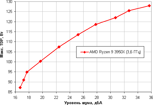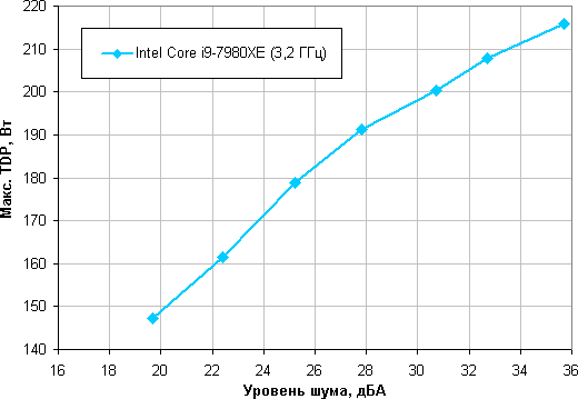 Ограничившись указанными выше условиями, построим зависимость реальной максимальной мощности (обозначенной как Макс. TDP), потребляемой процессором, от уровня шума: