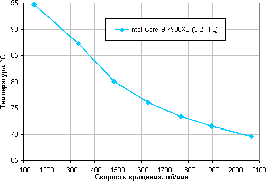 Зависимость температуры процессора при его полной загрузке от скорости вращения вентиляторов: