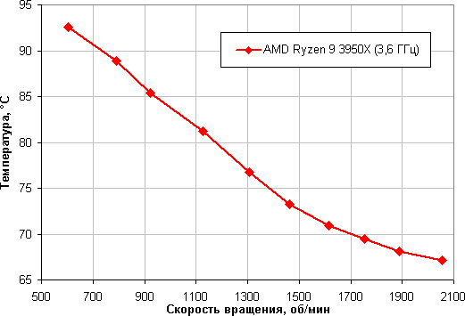В качестве дополнительного теста мы решили посмотреть, как кулер справится с охлаждением AMD Ryzen 9 3950X. Процессоры семейства Ryzen 9 являются сборками из трех кристаллов под одной крышкой. С одной стороны, увеличение площади, с которой снимается тепло, может улучшить охлаждающую способность кулера, но с другой — конструкция большинства кулеров оптимизирована для лучшего охлаждения именно центральной области процессора. Видимо, из-за этих особенностей есть мнение, что подобрать воздушный кулер для топовых процессоров Ryzen нового поколения не очень просто. В тестах использовался указанный процессор и материнская плата ASRock X570 Taichi. Все ядра процессора работали на фиксированной частоте 3,6 ГГц (множитель 36). Для установки этой частоты использовалась программа A-Tuning производителя системной платы. В качестве нагрузочного теста применялась программа powerMax (с использованием системы команд AVX). Потребление процессора при замерах по двум дополнительным разъемам 12 В на материнской плате под нагрузкой менялось от 153 Вт при 66 °C температуры процессора до 166 Вт при 92 °C.