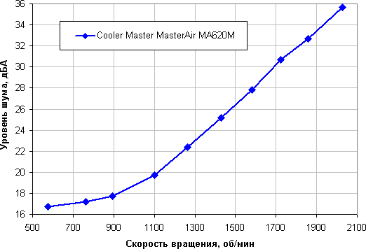 В этом тесте мы изменяли не только КЗ, но и напряжение, снизив его до 10 В в первой точке, при КЗ = 20%. Зависит, конечно, от индивидуальных особенностей и других факторов, но в случае кулеров где-то от 40 дБА и выше шум, с нашей точки зрения, очень высокий для настольной системы, от 35 до 40 дБА уровень шума относится к разряду терпимых, ниже 35 дБА шум от системы охлаждения не будет сильно выделяться на фоне типичных небесшумных компонентов ПК — вентиляторов в корпусе, в блоке питания и на видеокарте и жестких дисков, а где-то ниже 25 дБА кулер можно назвать условно бесшумным. Данный кулер является относительно тихим устройством.