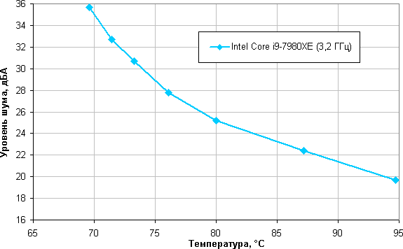 Зависимость уровня шума от температуры процессора при полной загрузке: