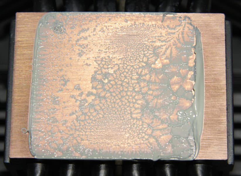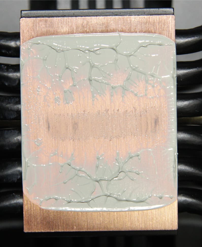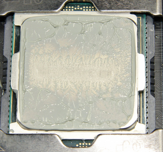 Видно, что термопаста распределилась тонким слоем почти по всей плоскости крышки процессора, а ее избыток выдавился по краям. В центре вдоль тепловых трубок есть широкая полоса плотного контакта.