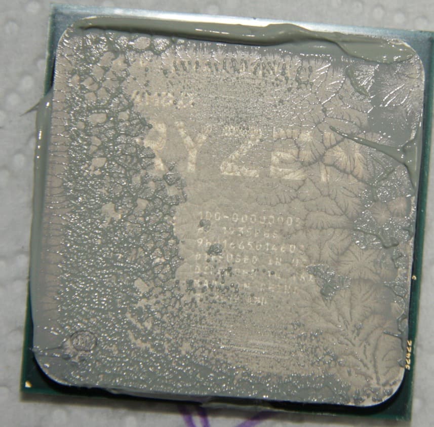 Пятно плотного контакта имеет большую площадь. Отметим, что распределение термопасты может немного искажаться при отделении теплосъемника от крышки процессора. В случае процессора AMD Ryzen 9 3950X теплосъемник настолько хорошо «приклеился» к процессору, что снять кулер удалось только вместе с процессором на теплосъемнике.
