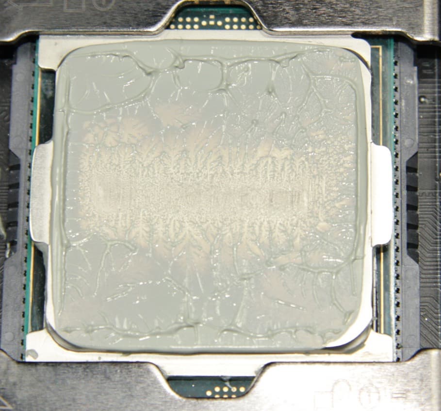 Преднанесенного термоинтерфейса нет, но производитель приложил к кулеру небольшой шприц с термопастой MasterGel Pro, количества которой хватит раза на три в случае экономичного расходования и процессоров с небольшой площадью крышки. При тестировании кулера мы использовали качественную термопасту от другого производителя. Продемонстрируем распределение термопасты после завершения тестов. На процессоре Intel Core i9-7980XE: