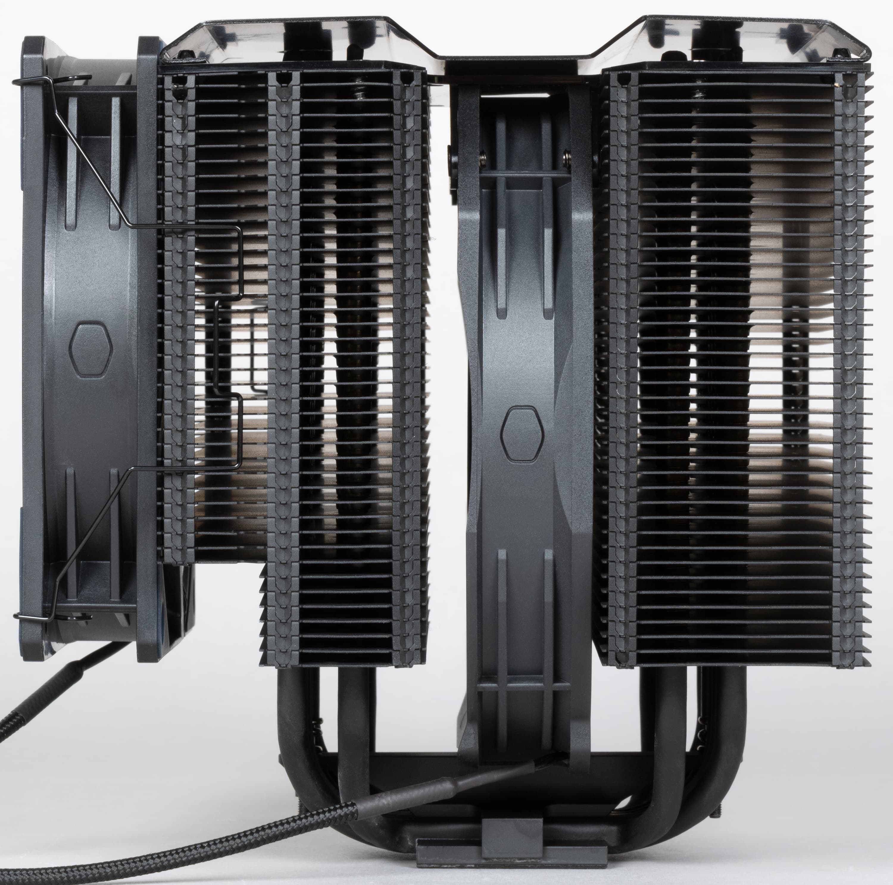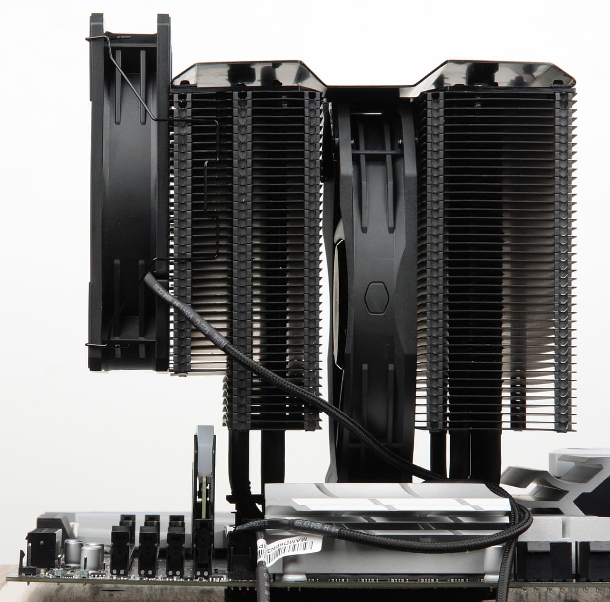 Типоразмер комплектных вентиляторов — 135 мм (центральный) и 120 мм (внешний). Внешний вентилятор работает на вдув и крепится типичными стальными скобками.