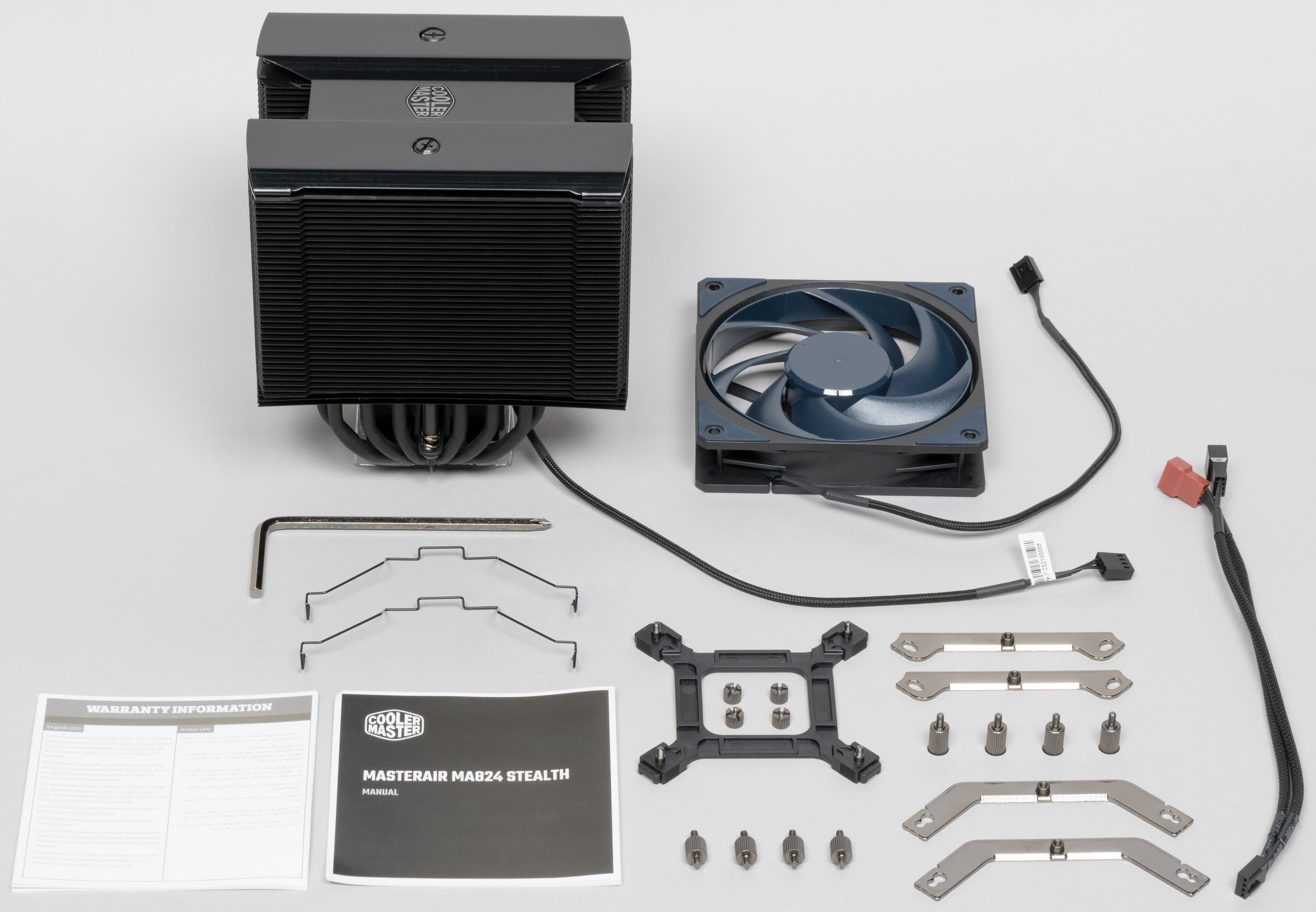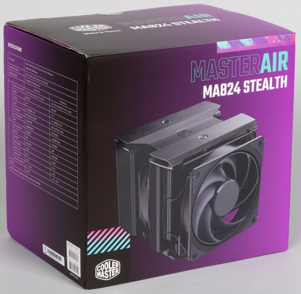 Поставляется процессорный охладитель Cooler Master MasterAir MA824 Stealth в красочно оформленной коробке из среднего по толщине гофрированного картона.