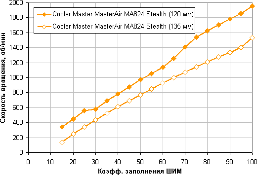 Отличный результат — плавный рост скорости вращения при изменении коэффициента заполнения (КЗ) от 15% до 100% и широкий диапазон регулировки. Отметим, что при КЗ 0% вентиляторы останавливаются, что может пригодится в гибридной системе охлаждения с пассивным режимом на минимальной нагрузке. Если точнее, то вентиляторы останавливается при снижении КЗ до 10% и запускаются при 11% в случае вентилятора 120 мм и 15% в случае 135 мм.