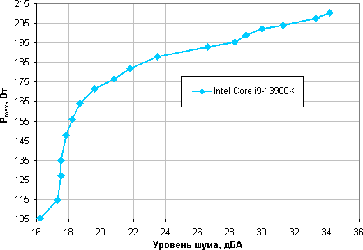 Приняв 25 дБА за критерий условной бесшумности, получим примерную максимальную мощность процессоров типа Intel Core i9-13900K, соответствующих этому уровню, это порядка 190 Вт. Гипотетически, если не обращать внимания на уровень шума, пределы мощности можно увеличить где-то до 210 Вт. Еще раз уточним: это в жестких условиях обдува радиатора нагретым до 44 градусов воздухом. При снижении температуры воздуха указанные пределы мощности для бесшумной работы и максимальной мощности возрастают.