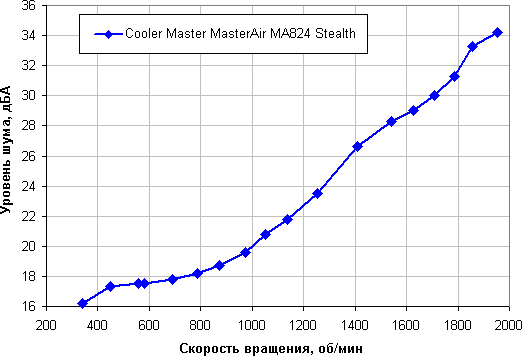 Зависит, конечно, от индивидуальных особенностей и других факторов, но в случае кулеров где-то от 40 дБА и выше шум с нашей точки зрения очень высокий для настольной системы, от 35 до 40 дБА уровень шума относится к разряду терпимых, ниже 35 дБА шум от системы охлаждения не будет сильно выделяться на фоне типичных небесшумных компонентов ПК — вентиляторов корпусных, на блоке питания, на видеокарте, а также жестких дисков, а где-то ниже 25 дБА кулер можно назвать условно бесшумным. Фоновый уровень был равен 16,1 дБА (условное значение, которое показывает шумомер). Этот кулер можно считать относительно тихим устройством.