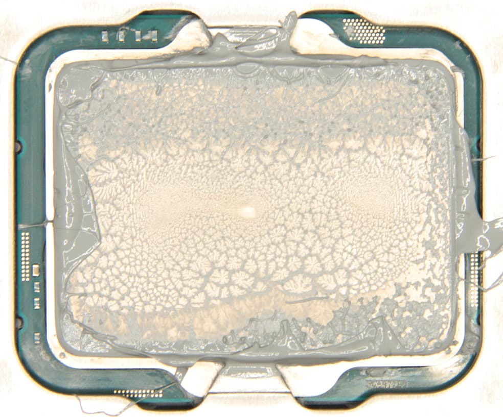 Видно, что термопаста распределилась тонким слоем по всей плоскости крышки процессора, а ее избыток выдавился по краям. Пятно плотного контакта большое.