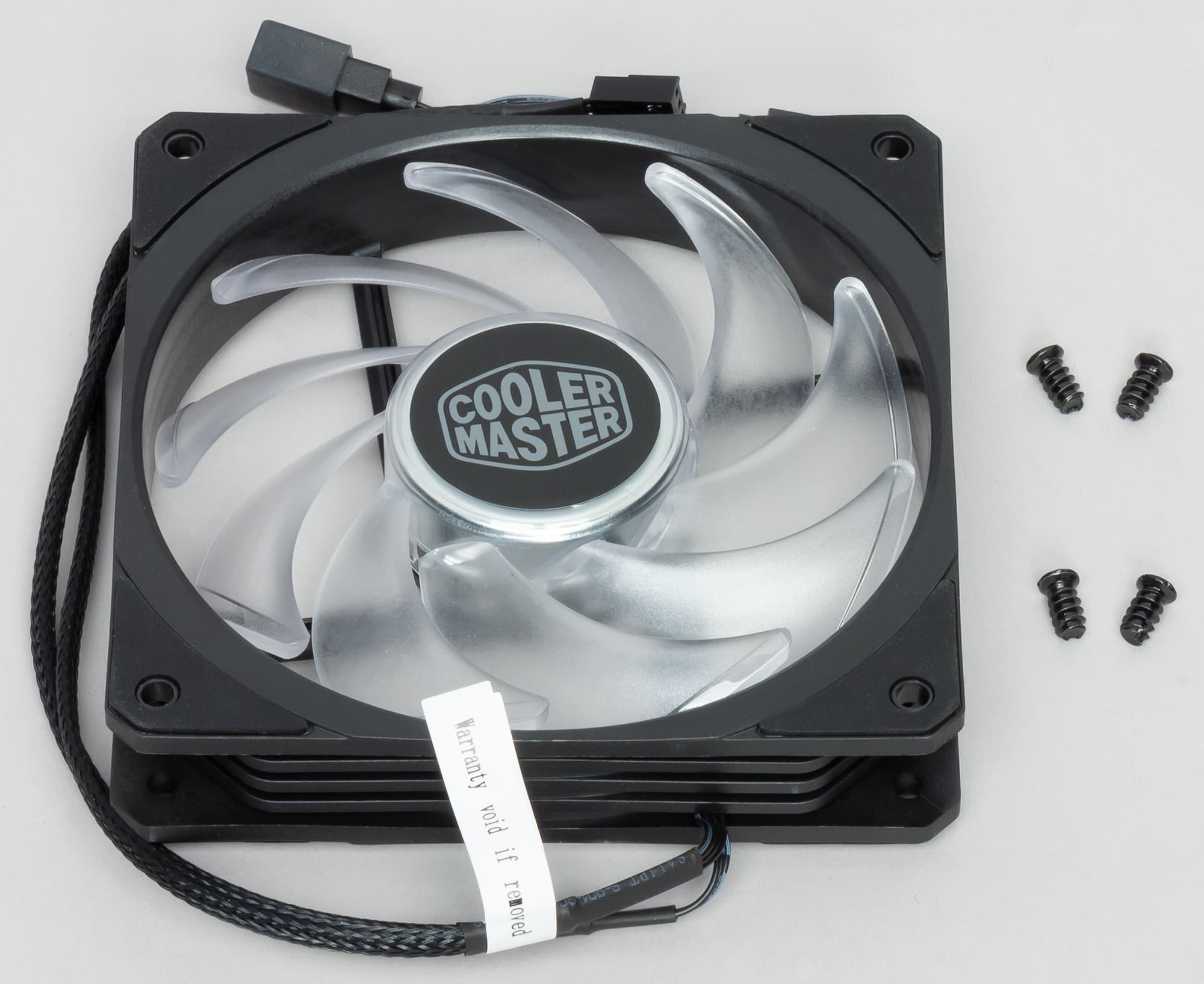 Под центральной втулкой крыльчатки находятся RGB-светодиоды в количестве четырех штук. От вентилятора отходит два кабеля, оба с четырехконтактными разъемами. Одним кабелем вентилятор подключается, например, к стандартным 3(4)-штырьковым разъемам на материнской плате. Вторым кабелем вентилятор подключается к источнику управляющих подсветкой сигналов, например, к отдельному контроллеру подсветки или к соответствующему разъему на материнской плате. Для последовательного соединения устройств с RGB-подсветкой от разъема-розетки отходит короткий плоский кабель с разъемом-вилкой, контакты которого, когда он не используется, закрывает заглушка из упругого пластика.