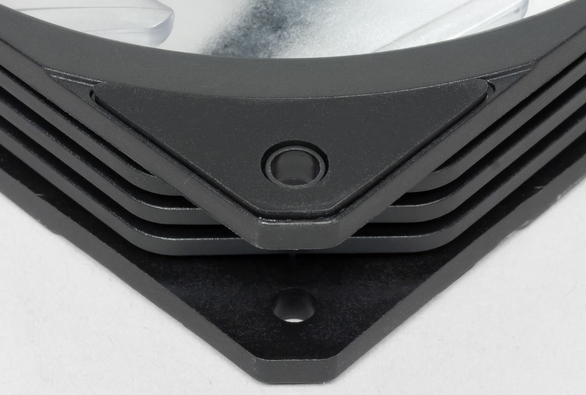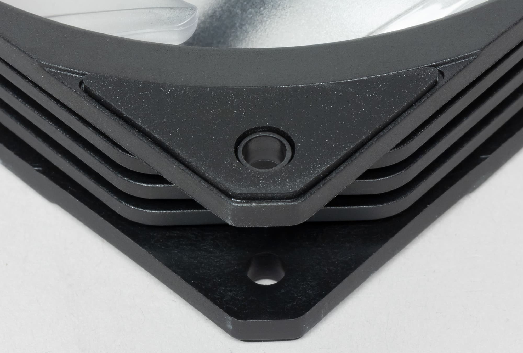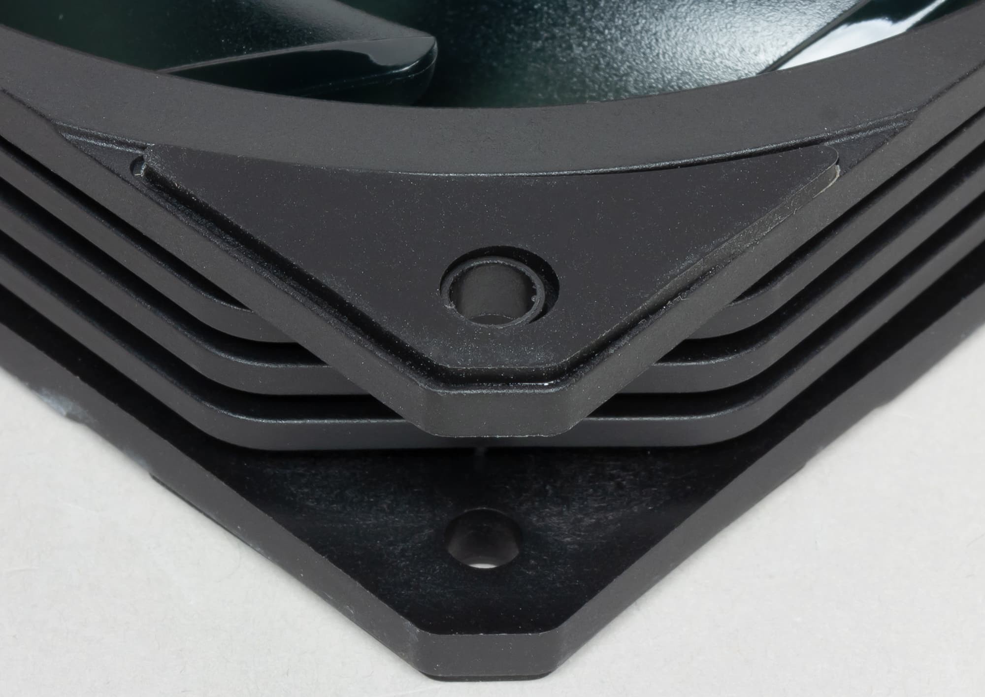 Рамка вентилятора изготовлена из черного прочного пластика. На ней есть ребра жесткости, что исключает возможные резонансные явления, которые могут привести к вибрации и увеличению шума при работе вентилятора. С менее жестки рамками такое возможно и уже нами встречалось.