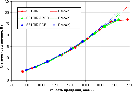 Максимальное статическое давление определялось при нулевом расходе воздуха, то есть определялась величина разрежения, которую создавал вентилятор, работающий на вытяжку из герметичной камеры (тазика). Отметим, что нам потребовалось использовать нелинейную экстраполяцию, так как используемый датчик давления после примерно 25 Па переходил в нелинейный режим и выше 27 Па значения не выдавал.