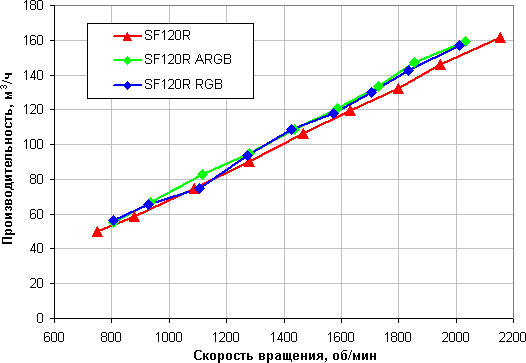Напомним, что в этом тесте мы создаем некое аэродинамическое сопротивление (весь поток воздуха проходит через крыльчатку анемометра), поэтому полученные значения отличаются в меньшую сторону от максимальной производительности в характеристиках вентилятора, так как последняя приводится для нулевого статического давления (отсутствует аэродинамическое сопротивление).