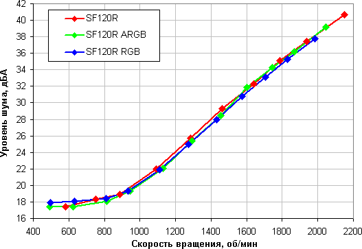 Отметим, что ниже примерно 18 дБА фоновый шум помещения и шумы измерительного тракта шумомера уже гораздо выше шума от вентилятора. Судя по отсутствию выраженных перегибов, явные резонансные эффекты отсутствуют — работает жесткая конструкция рамки.