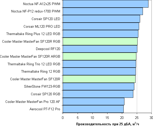 В современных условиях и в потребительском сегменте эргономика, как правило, имеет приоритет над производительностью, поэтому зафиксируем уровень шума на значении 25 дБА. Теперь для оценки вентиляторов достаточно сравнивать их производительность при данном уровне шума.