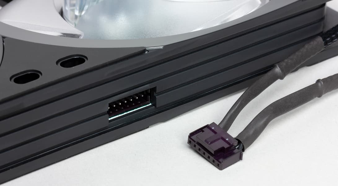 Под центральными втулками крыльчаток, а также внутри белой вставки находятся адресуемые RGB-светодиоды в количестве, как пишет производитель, 56 штук. Кабелем с трехконтактным разъемом вентилятор подключается, например, к отдельному контроллеру подсветки или к соответствующему разъему на материнской плате. Если ответный разъем тоже на кабеле и с гнездами, то для их стыковки можно использовать входящий в комплект трехштырьковый соединитель, а чтобы эти разъемы случайно не разъединились, они могут быть скреплены фиксатором, также находящимся в комплекте.