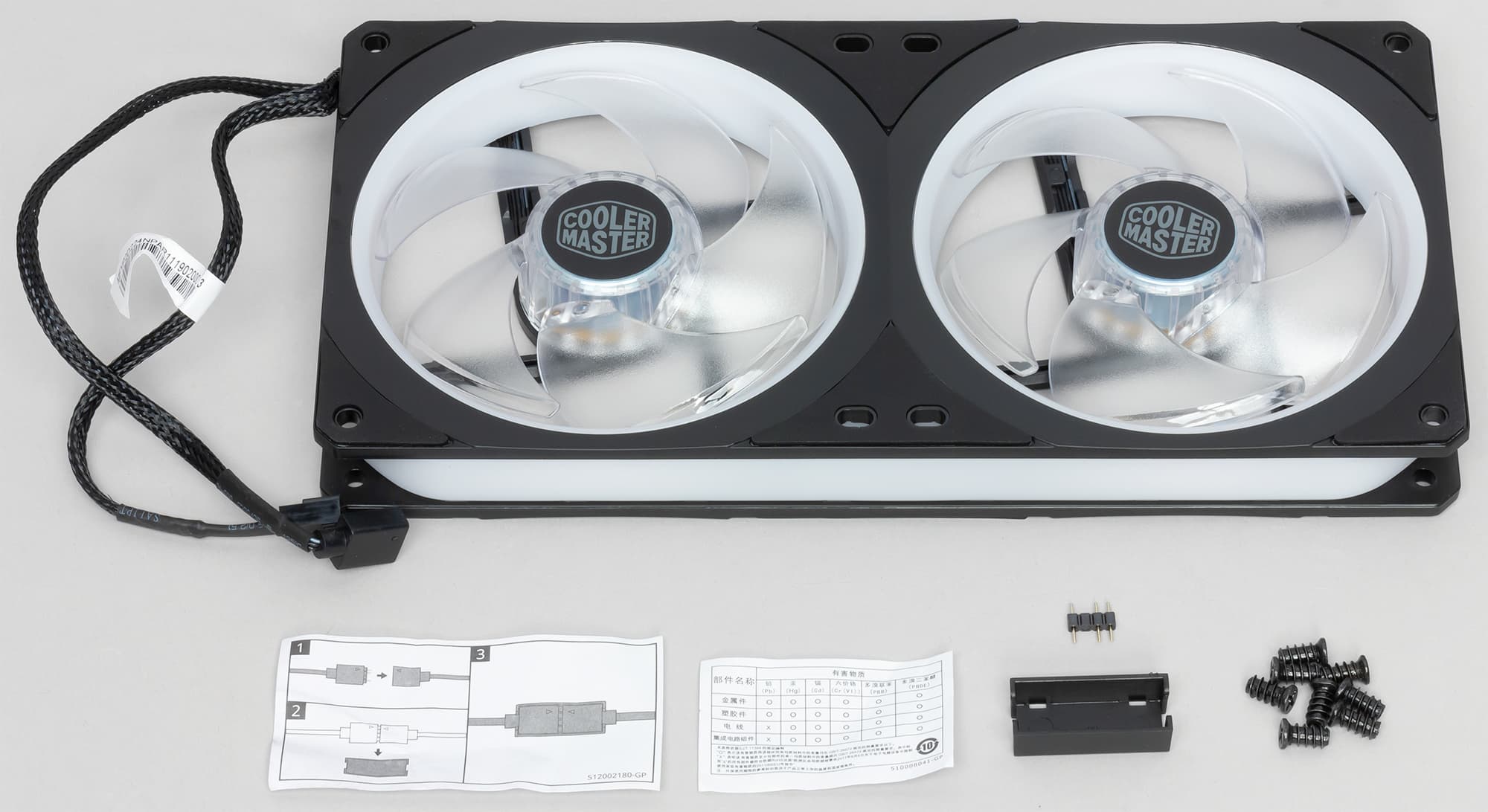На гранях коробочки изображен вентилятор, перечислены основные особенности, а также приведены технические характеристики продукта. Текст в основном на английском языке, но перечисление основных особенностей продублировано на нескольких других языках, в том числе и на русском. В комплект поставки кроме самого вентилятора включены крепежные винты, соединитель для разъемов подсветки и фиксатор этих разъемов.