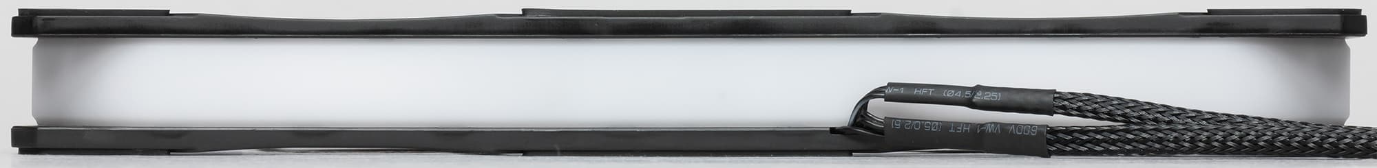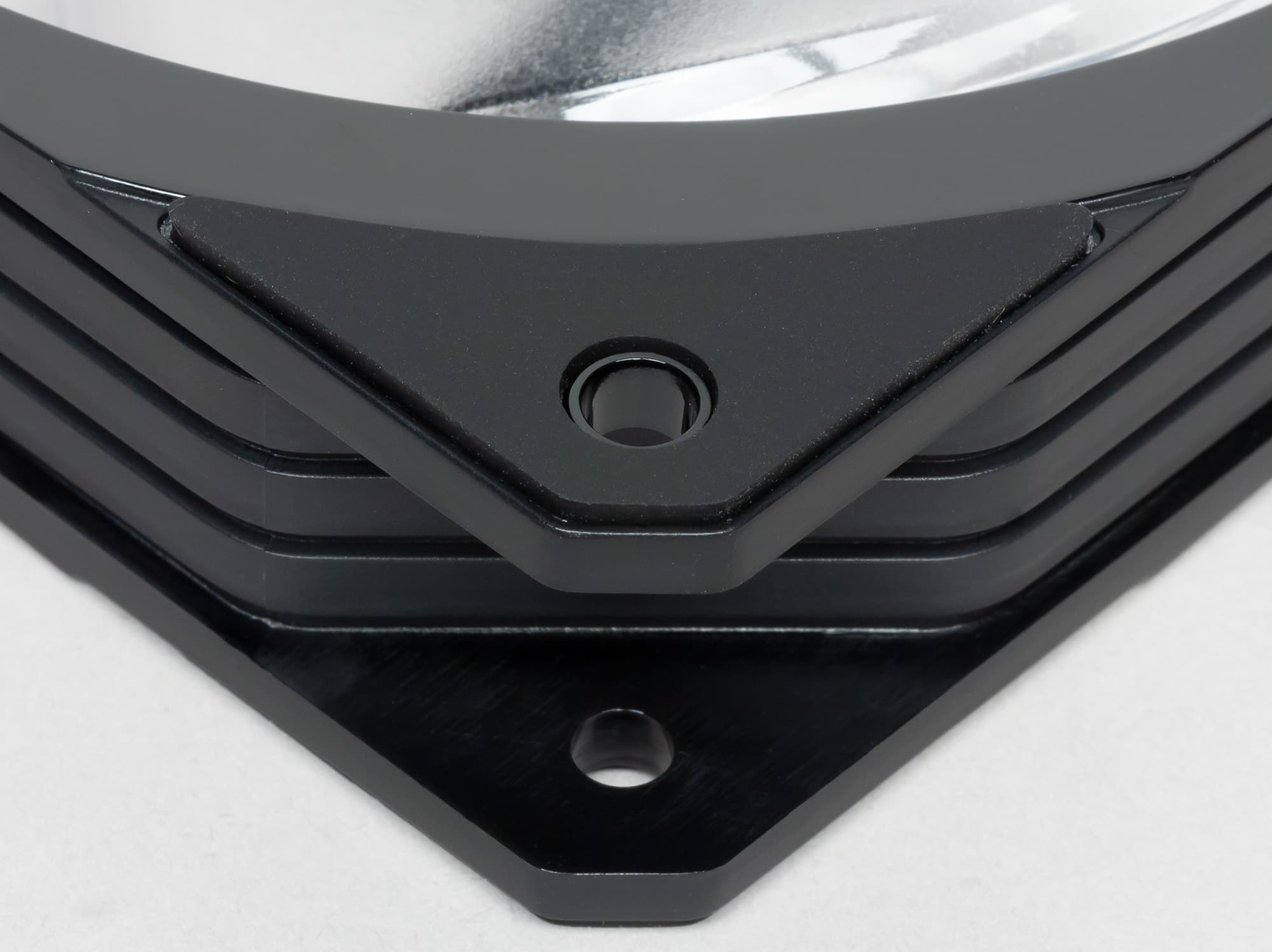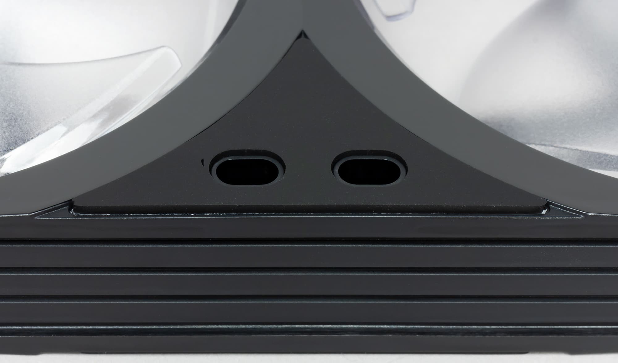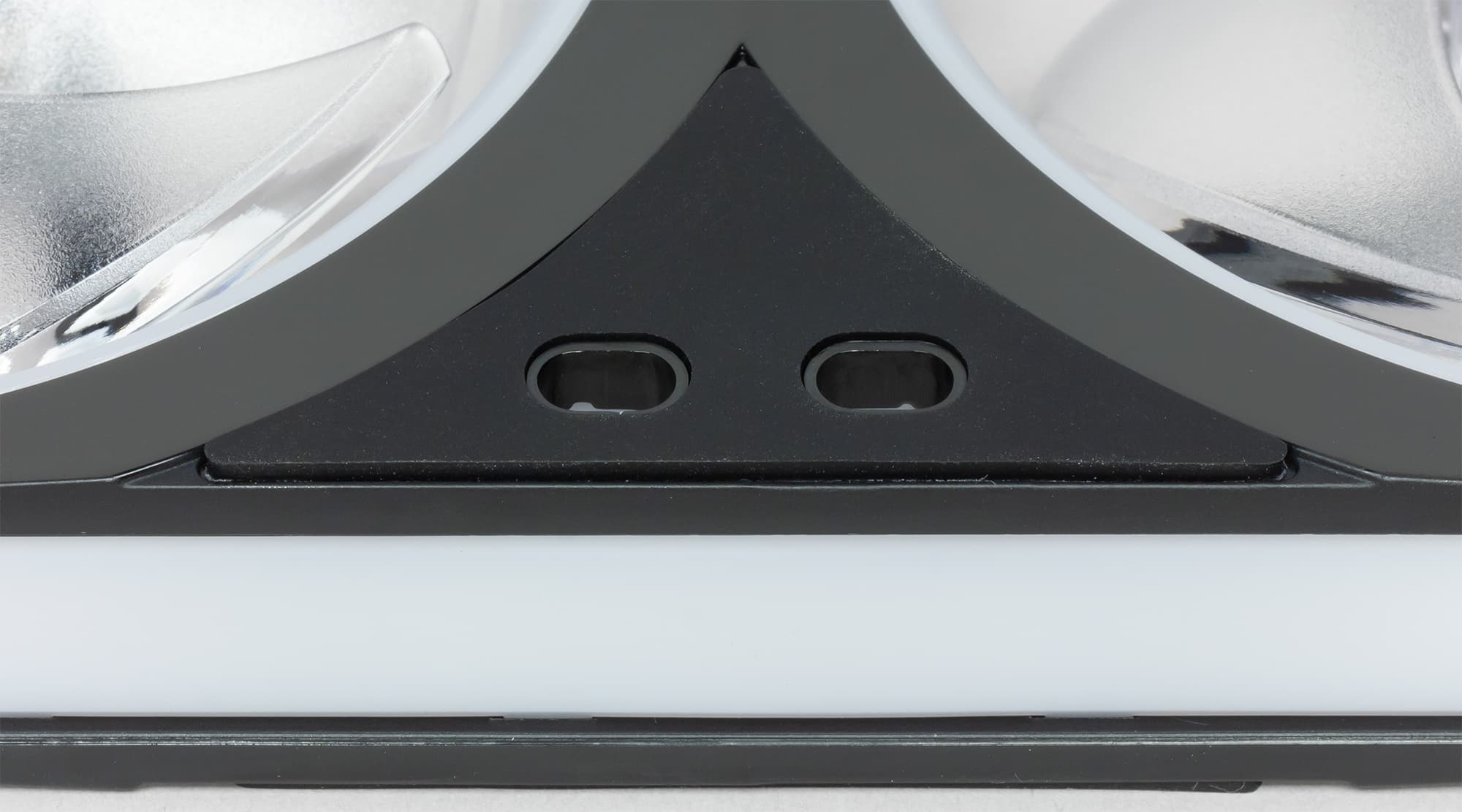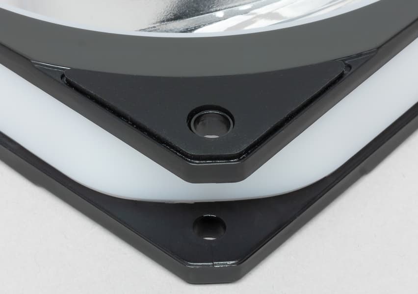 Рамка вентилятора трехслойная: между двумя панелями из черного пластика зажата вставка из белого полупрозрачного пластика с матовой поверхностью. Черные панели в области вокруг крыльчаток имеют зеркально гладкую поверхность, в остальных местах — матовую.