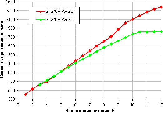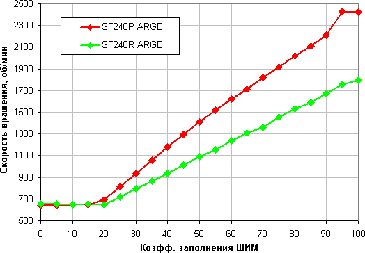 Когда нет сопротивления (точнее оно очень мало) ситуация меняется: SF240R ARGB работает лучше, чем SF240P ARGB.