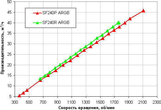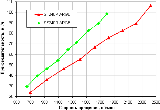 Без сопротивления вентиляторы прокачивают гораздо больше воздуха в единицу времени. Максимальная производительность в этом режиме выше указанных производителем величин. Едва обозначенное на предыдущем графике преимущество SF240R ARGB при отсутствии сопротивления проявилось в гораздо большей степени.