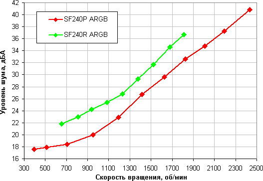 Отметим, что ниже примерно 18 дБА фоновый шум помещения и шумы измерительного тракта шумомера уже гораздо выше шума от вентилятора. Судя по отсутствию выраженных перегибов, явные резонансные эффекты отсутствуют — конструкция рамки у обоих вентиляторов достаточно жесткая. Видно, что при равных скоростях вращения крыльчаток вентилятор SF240R ARGB немного шумнее.