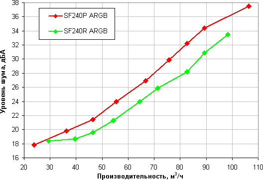 Отметим, что замеры уровня шума в отличие от определения производительности выполнялись без аэродинамической нагрузки, поэтому скорость вращения вентилятора SF240P ARGB была существенно выше (примерно на 15%) во время измерения шума при тех же входных параметрах. Для компенсации этого мы выполнили пересчет производительности к тем скоростям, что были измерены при замере уровня шума. В случае SF240R ARGB этого не потребовалось, так как в нем есть стабилизация скорости вращения (см. выше). Чем ниже и правее находится точка на графике выше, тем лучше вентилятор — работает тише, дует сильнее. Видно, что при сравнении двух вентиляторов на большей части диапазона SF240R ARGB ведет себя чуть хуже — больше шумит при той же производительности.