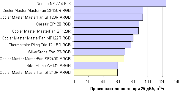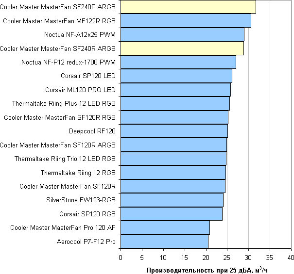 В современных условиях и в потребительском сегменте эргономика, как правило, имеет приоритет над производительностью, поэтому зафиксируем уровень шума на значении 25 дБА. Теперь для оценки вентиляторов достаточно сравнивать их производительность при данном уровне шума.