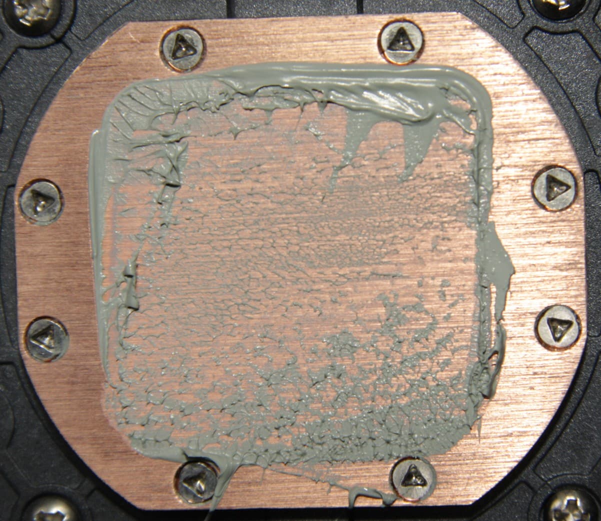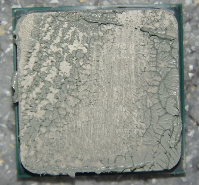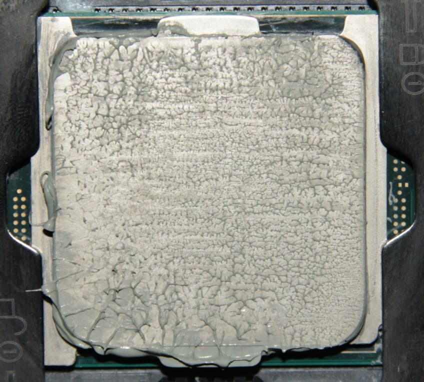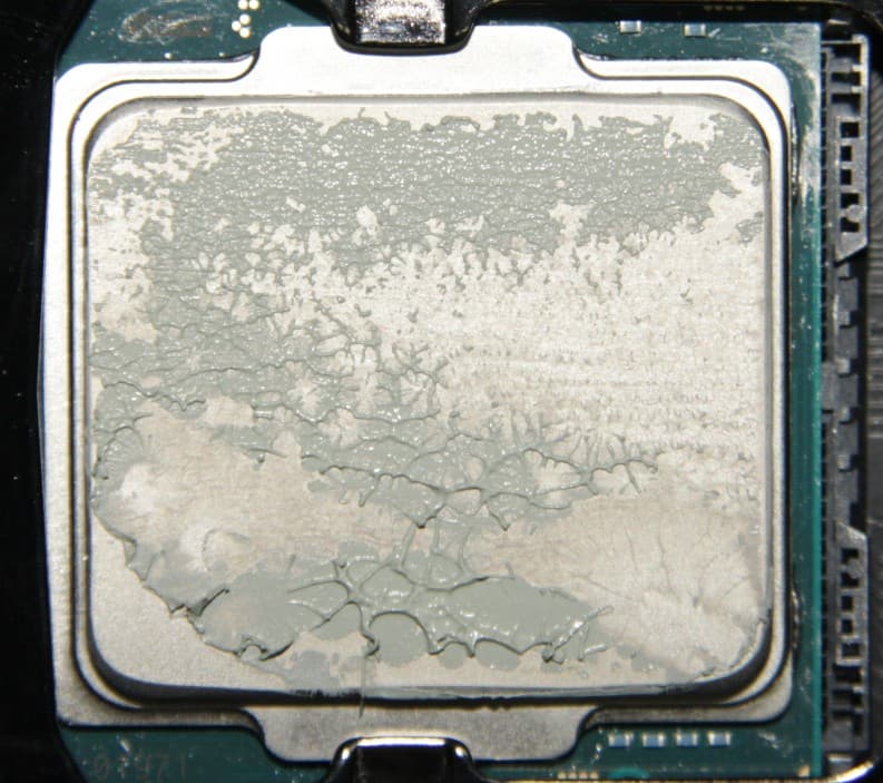 Видно, что термопаста распределилась очень тонким слоем на большей части площади крышки процессора, а ее избытки выдавились за края. Участок плотного контакта имеет большую площадь.