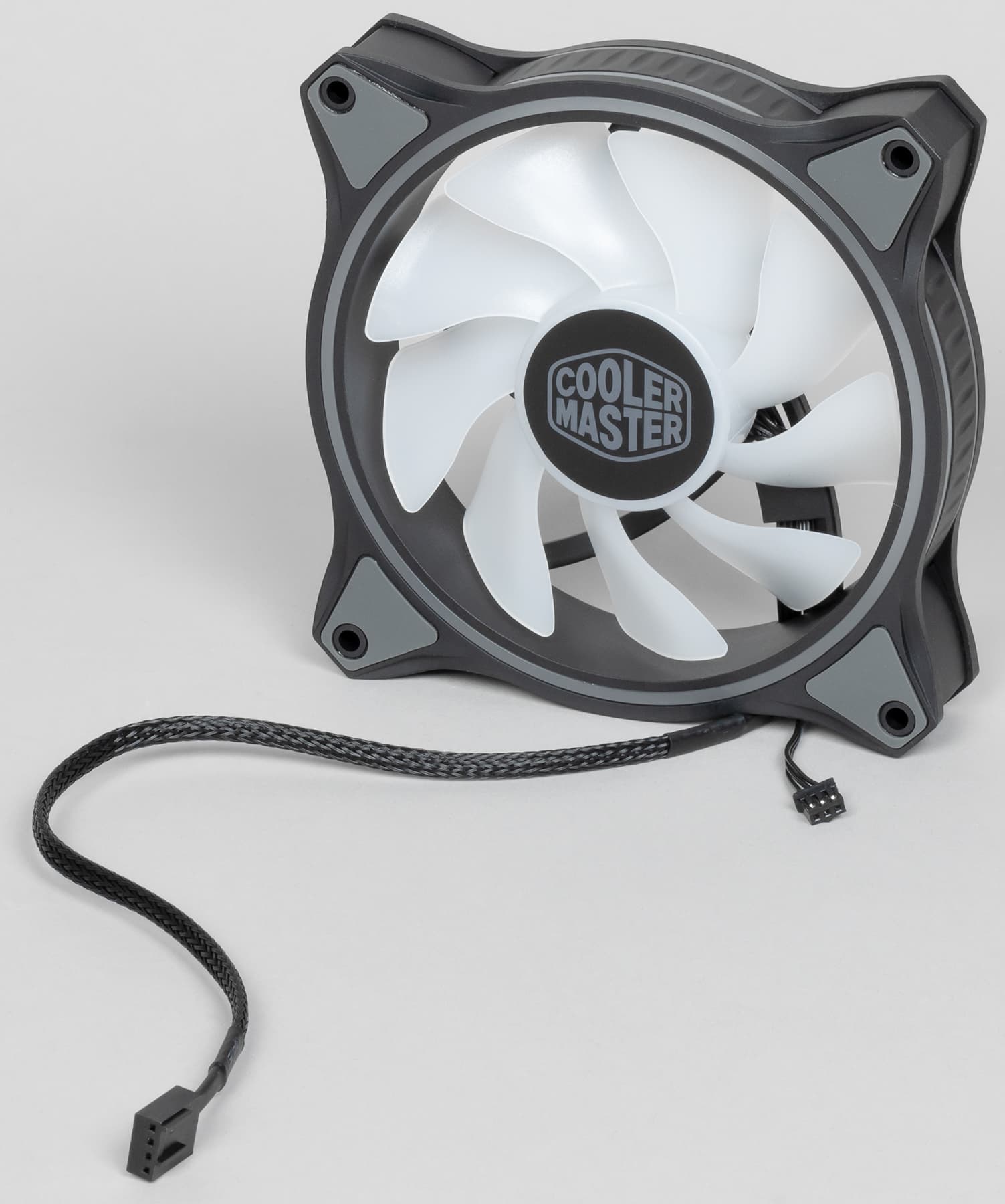 Вентилятор имеет четырехконтактный разъем (общий, питание, датчик вращения и управление ШИМ) на конце кабеля питания длиной 29,5 см. Этот кабель заключен в скользкую плетеную оболочку. Согласно легенде, оболочка уменьшает аэродинамическое сопротивление, но принимая во внимание толщину плоского трех/четырехпроводного кабеля внутри этой оболочки и ее внешний диаметр, мы в правдивости этой легенды сильно сомневаемся. Впрочем, оболочка позволит сохранить единый стиль оформления внутреннего убранства корпуса. Оболочка есть и на сегменте разветвителя питания вентиляторов. Его общая длина 23 см, из которых 9 см приходится на ответвления на три разъема. На подсветку идет отдельный кабель длиной всего 5 см с трехконтактным разъемом.