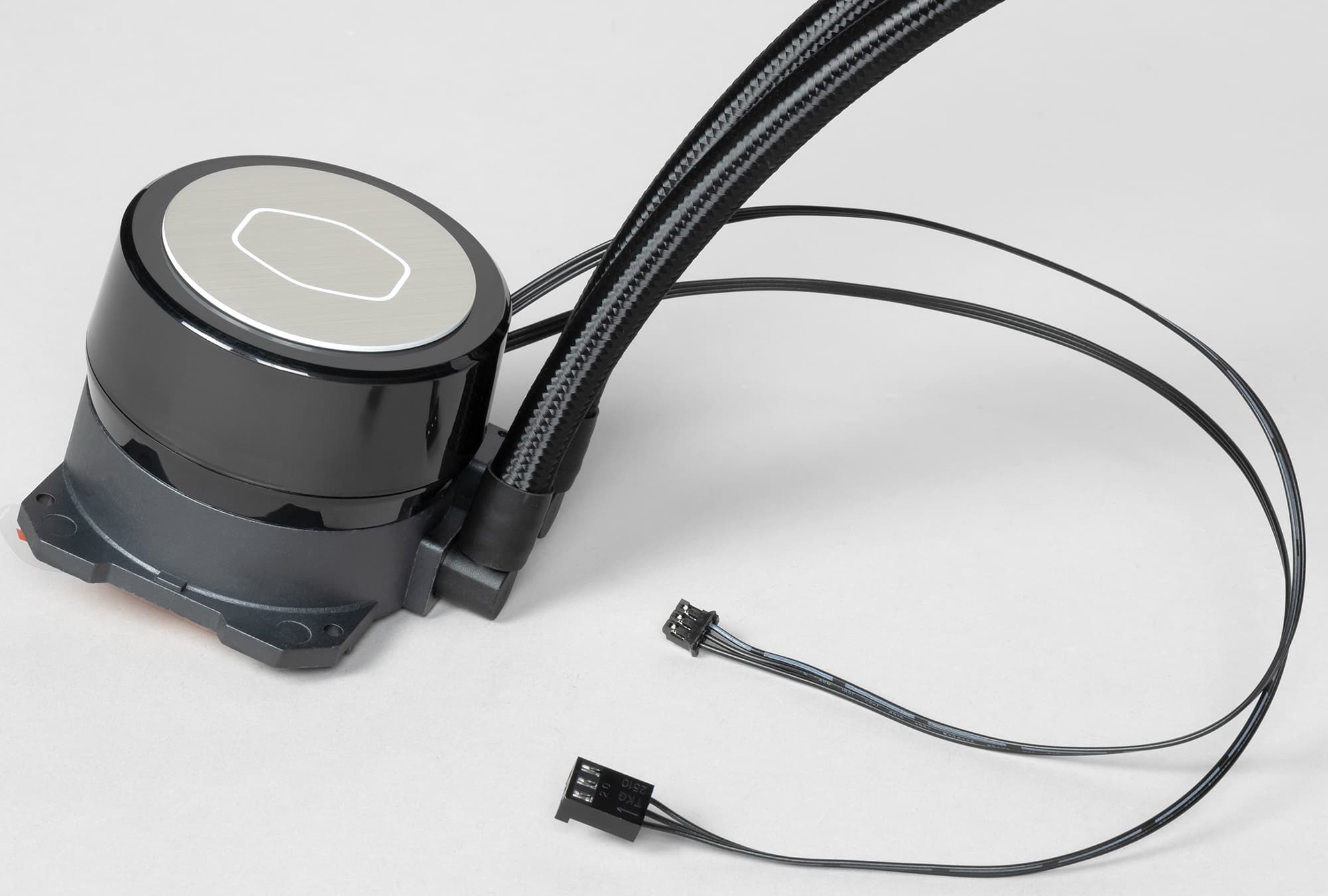 Отсоединяемый кабель питания (длиной 45 см) контроллера подключается с помощью разъема питания SATA, что гораздо удобнее, чем к периферийному разъему («типа Molex»). Контроллер оснащен тремя разъемами для подключения устройств с адресуемой подсветкой. Для подключения этой системы используется всего один разъем, так как подключение помпы и трех вентиляторов осуществляется с помощью одного кабеля с четырьмя выходными разъемами (от входного до первого разъема 45 см, далее по 14 см до следующего). Если на материнской плате или на другом контроллере подсветки есть стандартный трехконтактный разъем для подключения ARGB-подсветки, то контроллер из комплекта можно не использовать. Хвост до входного разъема альтернативного типа имеет длину 5 см. Если подключить контроллер к системной плате посредством кабеля USB (длиной 59,5 см), то управлять подсветкой можно будет с помощью программы MasterPlus. Без подключения к ПК активен режим по умолчанию, как при этом подсвечиваются вентиляторы и помпа можно посмотреть на видео ниже: