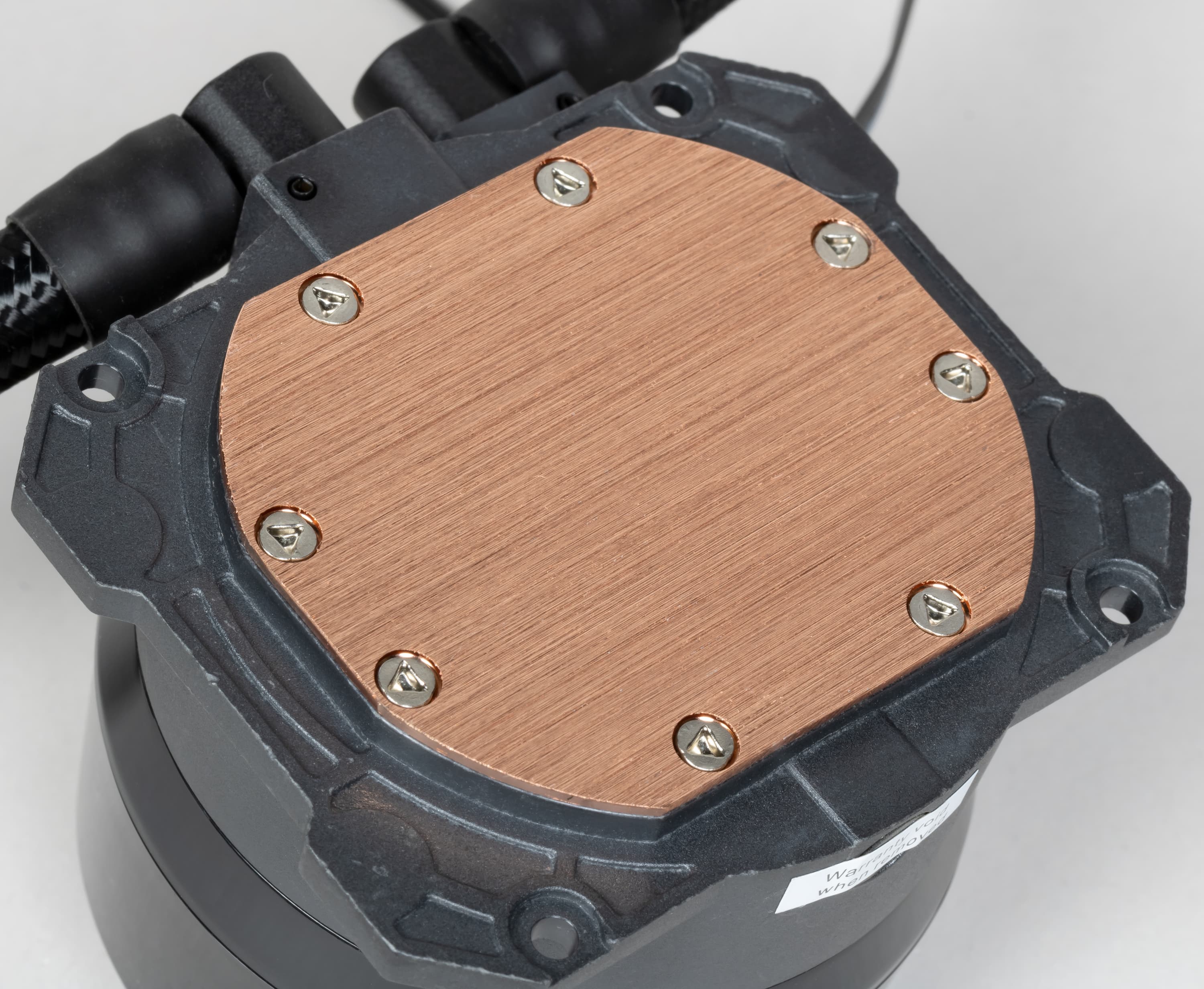 Система герметичная, заправлена, готова к использованию. Помпа интегрирована в один блок с теплосъемником. Производитель указывает, что водоблок двухкамерный, видимо сверху камера помпы, а снизу — камера теплосъемника. Подошвой теплосъемника, непосредственно прилегающей к крышке процессора, служит медная пластина толщиной 1,5 мм. Ее внешняя поверхность шлифованная, но не полированная и чуть-чуть, где-то на 0,1 мм, выпуклая к центру.