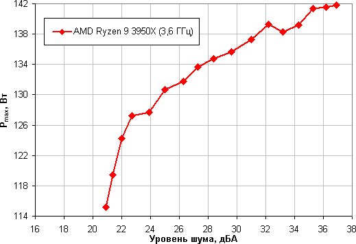 Приняв 25 дБА за критерий условной бесшумности, получим, что максимальная мощность процессора, соответствующая этому уровню, составляет порядка 130 Вт. Если не обращать внимания на уровень шума, то предел мощности можно увеличить где-то до 140 Вт. Еще раз уточним: это в жестких условиях обдува радиатора нагретым до 44 градусов воздухом. При снижении температуры воздуха указанные пределы мощности для бесшумной работы и максимальной мощности возрастают. Результат заметно хуже, чем в случае процессора Intel Core i9-7980XE. Впрочем, при условии достаточно хорошей вентиляции в корпусе данный кулер вполне справится с охлаждением процессора AMD Ryzen 9 3950X, но на возможность существенного разгона рассчитывать уже не стоит.