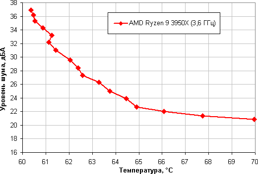 Зависимость уровня шума от температуры процессора при полной загрузке: