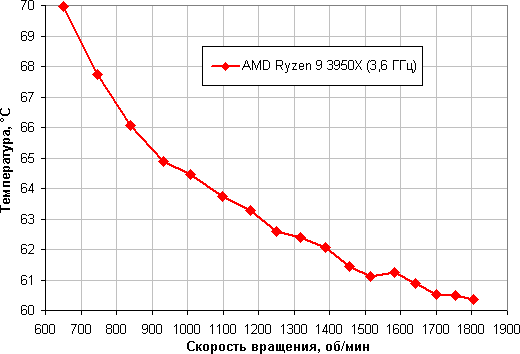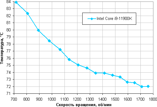 Зависимость температуры процессора при его полной загрузке от скорости вращения вентиляторов: