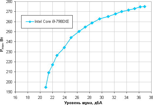 Приняв 25 дБА за критерий условной бесшумности, получим примерную максимальную мощность процессоров, соответствующих этому уровню. Это порядка 245 Вт для процессора Intel Core i9-7980XE. Если не обращать внимания на уровень шума, то пределы мощности можно увеличить где-то до 275 Вт. Еще раз уточним, это в жестких условиях обдува радиатора нагретым до 44 градусов воздухом, при снижении температуры воздуха указанные пределы мощности для бесшумной работы и максимальной мощности возрастают.