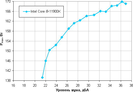 Приняв 25 дБА за критерий условной бесшумности, получим, что максимальная мощность процессора, соответствующая этому уровню, составляет порядка 155 Вт. Если не обращать внимания на уровень шума, то предел мощности можно увеличить где-то до 170 Вт. Еще раз уточним: это в жестких условиях обдува радиатора нагретым до 44 градусов воздухом. При снижении температуры воздуха указанные пределы мощности для бесшумной работы и максимальной мощности возрастают.