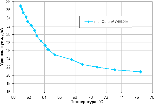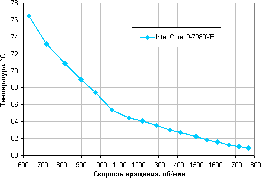 В этом тесте наш процессор Intel Core i9-7980XE при 24 градусах окружающего воздуха не перегревается даже на минимальных оборотах вентиляторов в случае регулировки с помощью только ШИМ.