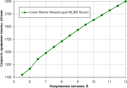 Помпа останавливается при снижении напряжения до 4,8 В и запускается от 5,0 В. Получается, что помпу лучше не подключать к 5 В, так как ее запуск не гарантирован. Уровень шума только от помпы, когда она работает на максимальной скорости, равен 20,4 дБА. Помпа работает очень тихо, поэтому снижать шум от системы, уменьшая напряжение питания помпы, смысла нет.