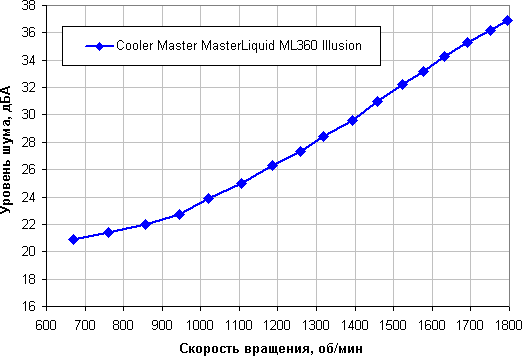 Уровень шума от этой системы охлаждения невысокий во всем диапазоне скорости вращения вентиляторов. Зависит, конечно, от индивидуальных особенностей и других факторов, но где-то от 40 дБА и выше шум, с нашей точки зрения, очень высокий для настольной системы; от 35 до 40 дБА уровень шума относится к разряду терпимых; ниже 35 дБА шум от системы охлаждения не будет сильно выделяться на фоне типичных небесшумных компонентов ПК — корпусных вентиляторов, вентиляторов на блоке питания и на видеокарте, а также жестких дисков; а где-то ниже 25 дБА кулер можно назвать условно бесшумным. Фоновый уровень был равен 16,3 дБА (условное значение, которое показывает шумомер).