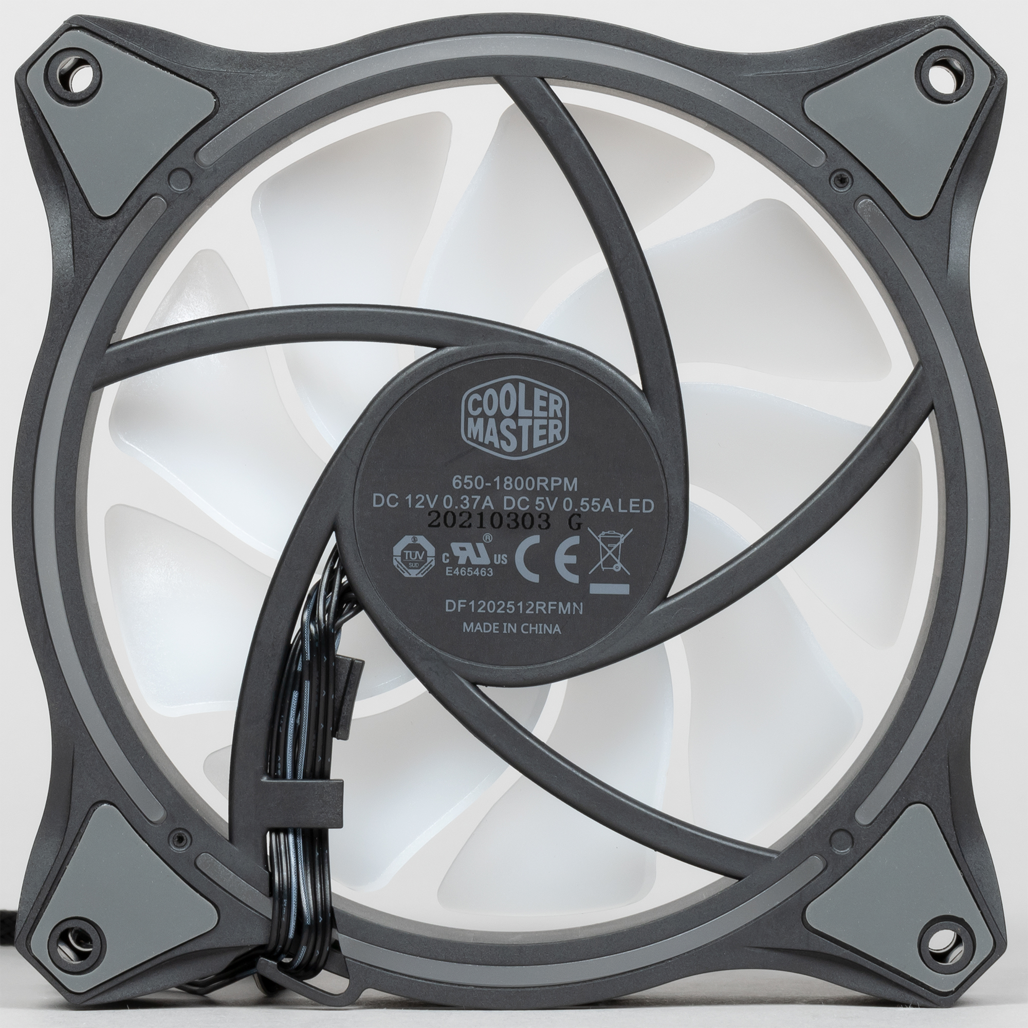 Рамка вентилятора, изготовленная из прочного черного пластика, составная: центральная часть зажата между двух внешних. Между частями рамки есть две кольцевые вставки из белого полупрозрачного пластика. В свою очередь между вставками находится светодиодная лента с 16 адресуемыми многоцветными светодиодами (ARGB). Крыльчатка вентилятора также изготовлена из белого полупрозрачного пластика и снаружи слегка заматирована. На статоре вентилятора по окружности размещены еще восемь ARGB-светодиодов, которые подсвечивают крыльчатку изнутри. На проушины в углах рамки вентилятора наклеены виброизолирующие резиновые накладки. В несжатом состоянии они выступают примерно на 0,5 мм относительно плоскости рамки. По замыслу разработчиков, это должно обеспечивать виброразвязку вентилятора от места крепления. Однако если прикинуть соотношение массы вентилятора к жесткости накладок, то становится понятно, что резонансная частота конструкции получается очень высокой, то есть практически никакой виброразвязки быть не может. Кроме того, гнезда, куда вворачиваются крепежные винты, являются частью рамки вентилятора, поэтому вибрация от вентилятора через винты без помех передается на радиатор. В итоге, такую конструкцию проушин можно рассматривать только в качестве элемента дизайна вентилятора.