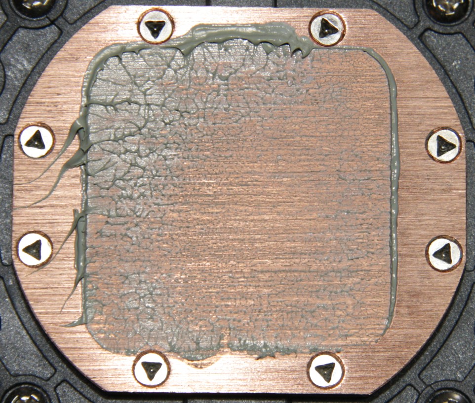 Пятно плотного контакта есть, но местами слой термопасты толстоват, и не вся крышка процессора оказалась покрыта термопастой. Разумеется, распределение термопасты, в какой-то степени изменилось при разъединении процессора и помпы.