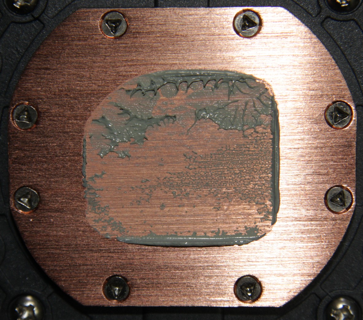 Габариты этой пластины — 58×50 мм, а внутренняя часть, ограниченная отверстиями под винты, имеет размеры примерно 47×39 мм. Термопаста в маленьком шприце, что, конечно, менее удобно, чем преднанесенный слой. Комплектного запаса термопасты должно хватить раза на два в случае процессоров с небольшой площадью крышки и при экономном расходе. В тестах использовалась не менее качественная термопаста другого производителя. Забегая вперед, продемонстрируем распределение термопасты после завершения всех тестов. На процессоре Intel Core i9-7980XE: