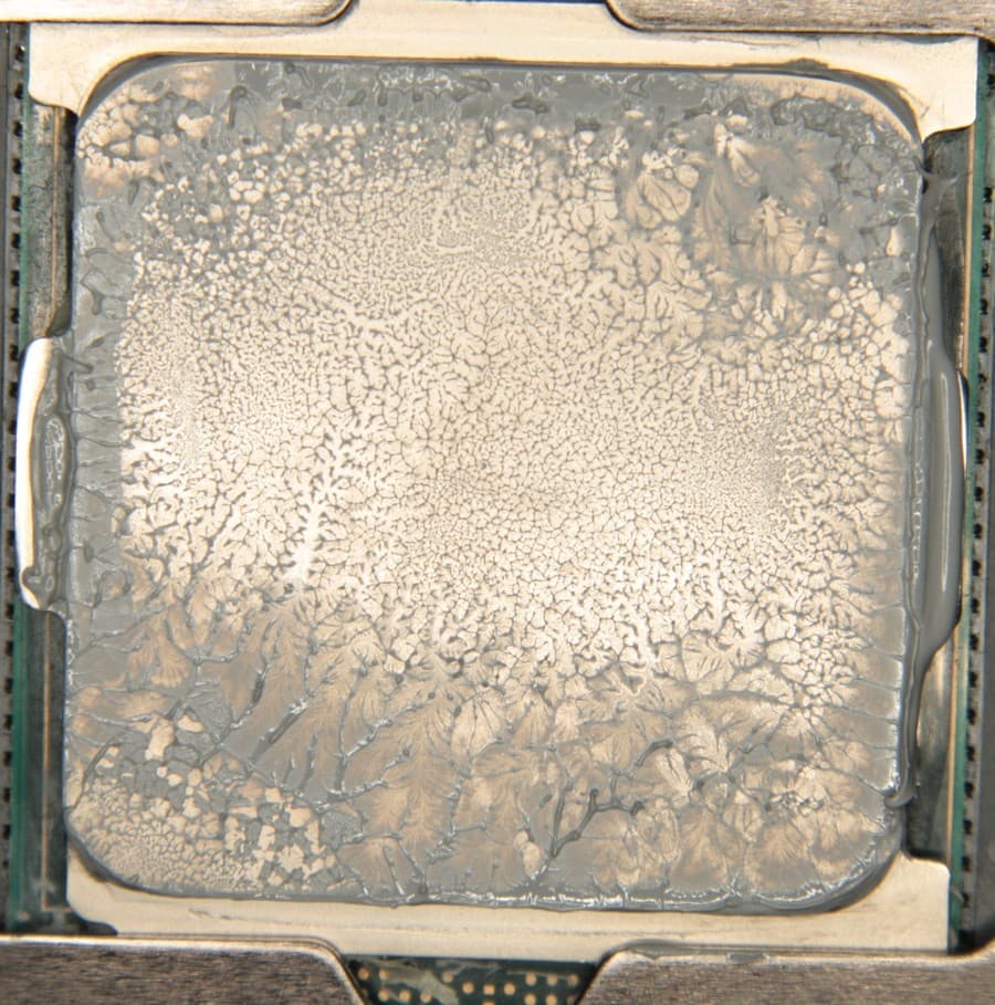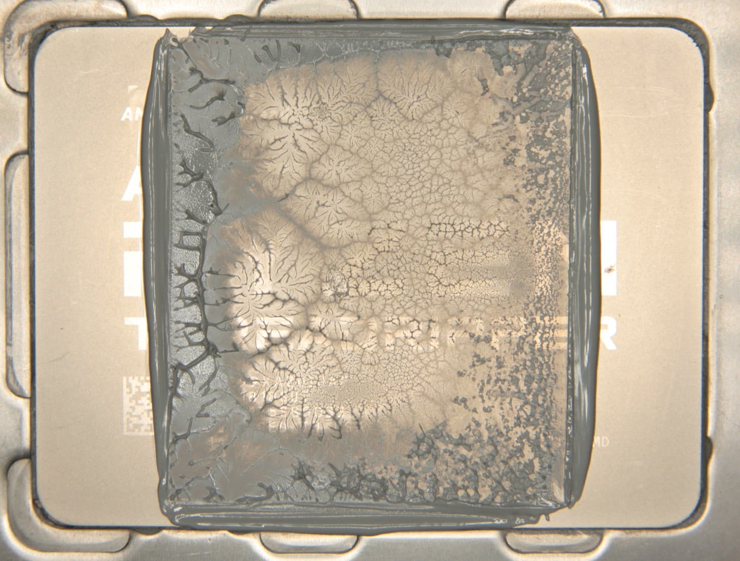 Термопаста в маленьком шприце, что, конечно, менее удобно, чем преднанесенный слой. Комплектного запаса термопасты должно хватить раза на два в случае процессоров с небольшой площадью крышки и при экономном расходе. В тестах использовалась не менее качественная термопаста другого производителя. Забегая вперед, продемонстрируем распределение термопасты после завершения всех тестов. На процессоре Intel Core i9-7980XE: