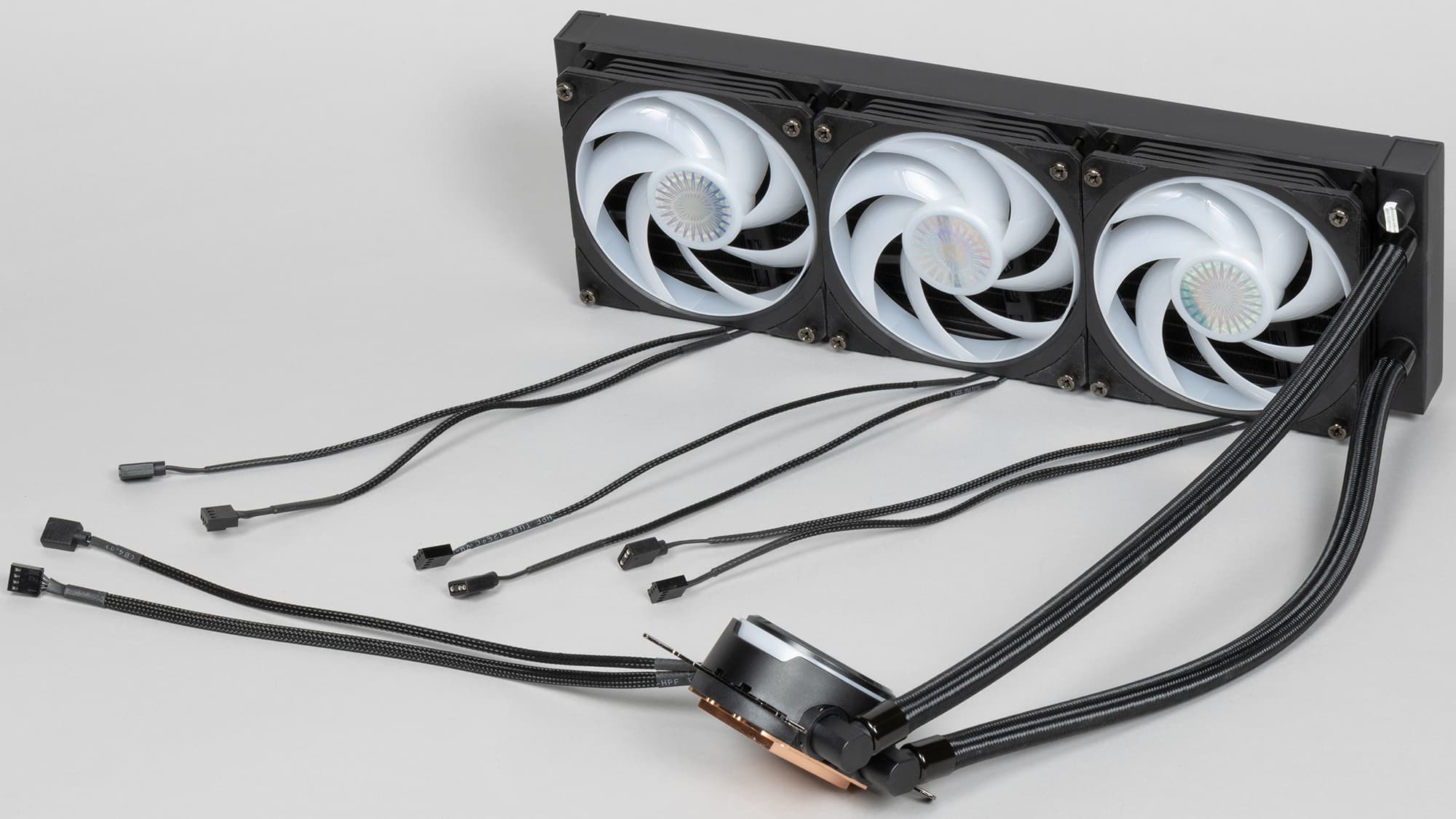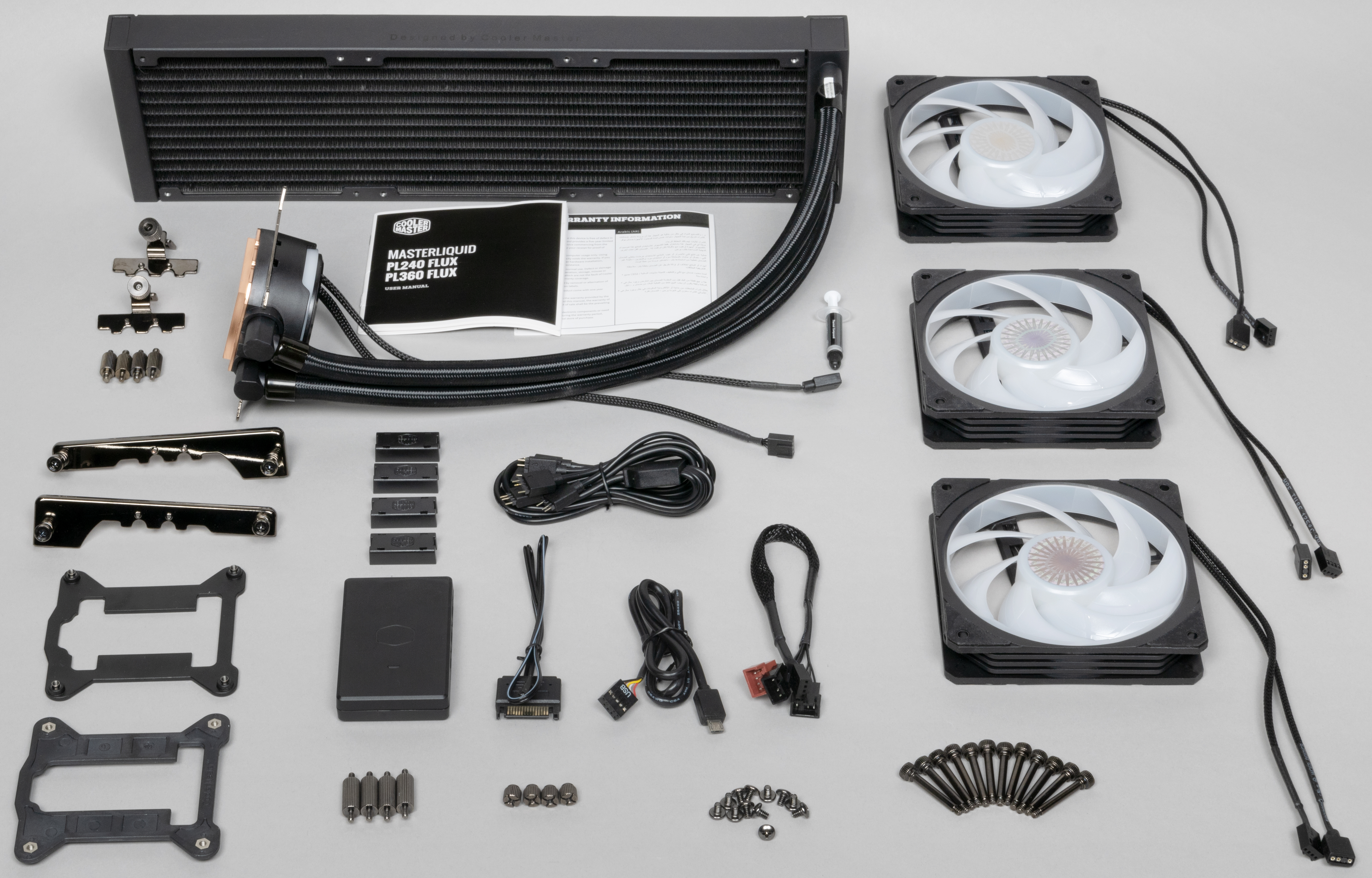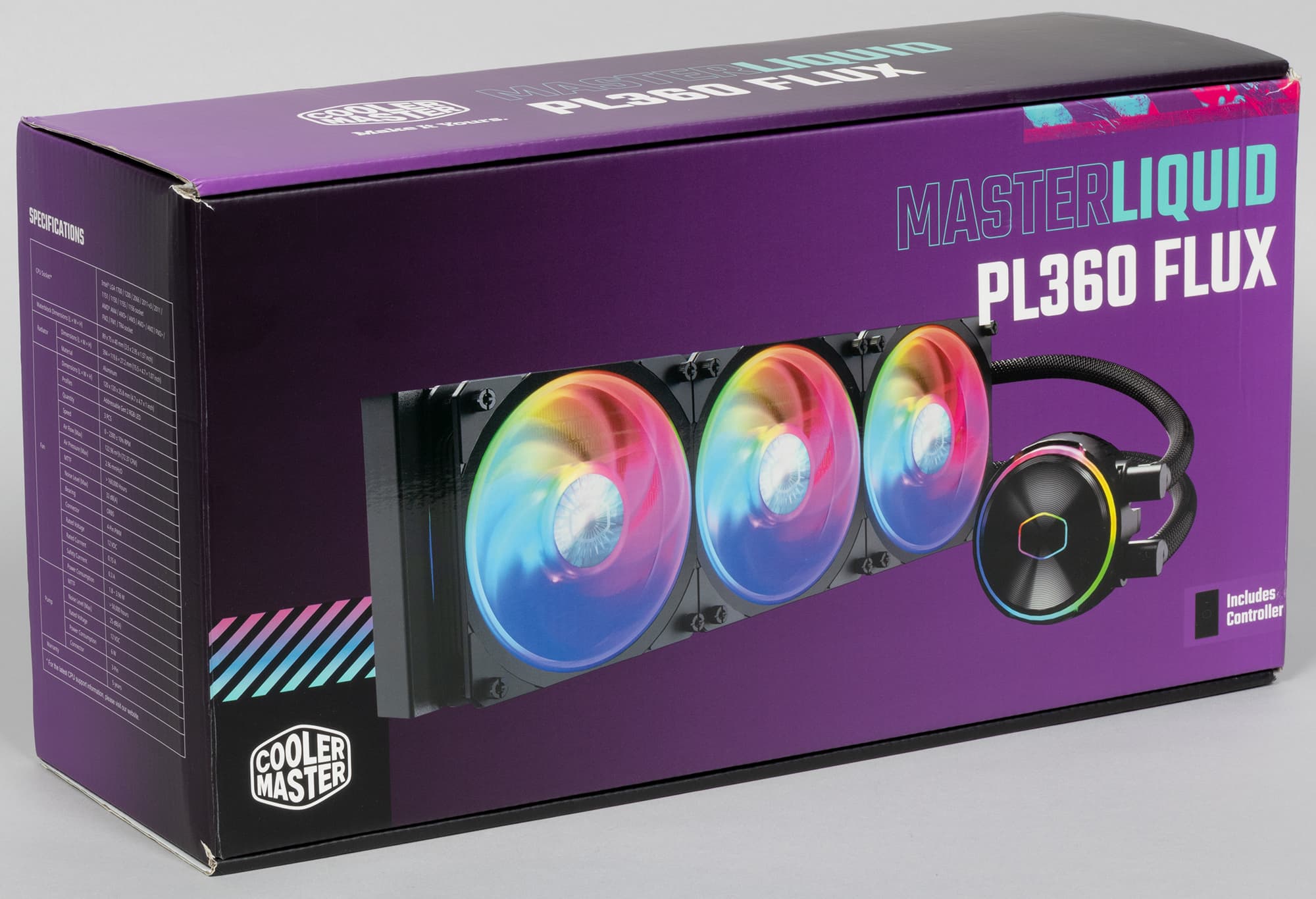 На основе системы жидкостного охлаждения Cooler Master MasterLiquid PL360 Flux можно создать условно бесшумный компьютер (уровень шума 25 дБА и ниже), оснащенный процессором типа Intel Core i9-7980XE (Intel LGA2066, Skylake-X (HCC)), если потребление процессора под максимальной нагрузкой не будет превышать 240 Вт, а температура внутри корпуса не повысится выше 44 °C. Процессор типа AMD Ryzen Threadripper 2990WX эта СЖО может бесшумно охлаждать, если потребление процессора не превысит 210 Вт. При снижении температуры охлаждающего воздуха и/или менее жестких требованиях к уровню шума пределы мощности во всех случаях можно увеличить. В области средней и высокой производительности эта СЖО одна из самых эффективных в своем классе среди протестированных в нашей лаборатории. Любители моддинга оценят многоцветную и многозонную статическую или динамическую подсветку вентиляторов и помпы, имеющую стандартное трехконтактное подключение. Подсветкой вентиляторов и помпы можно управлять с помощью контроллера, входящего в комплект поставки, и программы MasterPlus. Среди прочих достоинств отметим хорошее качество изготовления, оплетку кабелей и шлангов (как минимум помогающую сохранить единый стиль оформления внутренностей компьютера), подключение контроллера к разъему питания SATA, удобный крепеж вентиляторов и довольно длинные шланги.