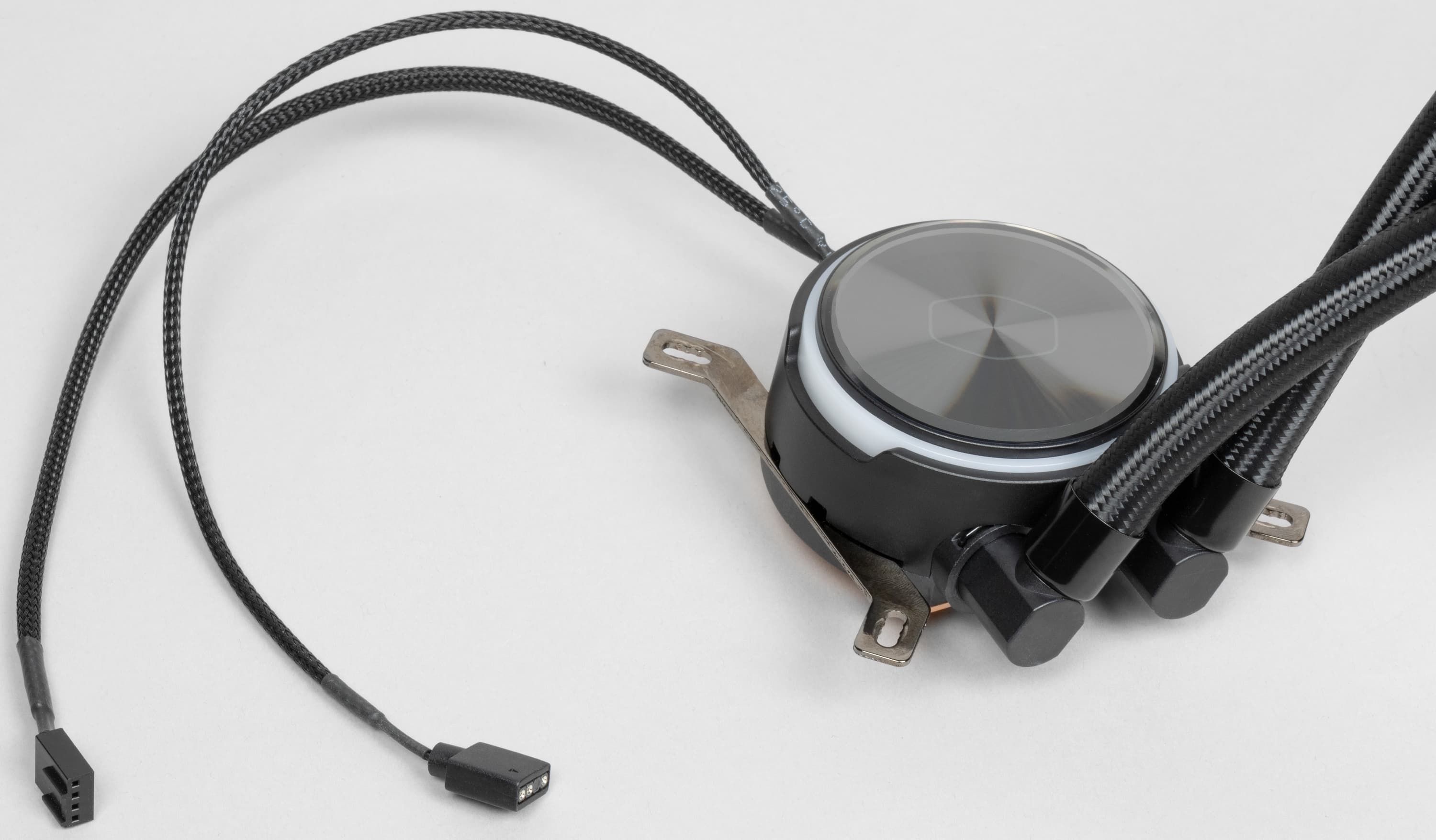 Отсоединяемый кабель питания (длиной 45 см) контроллера подключается с помощью разъема питания SATA, что гораздо удобнее, чем к периферийному разъему («типа Molex»). Контроллер оснащен тремя разъемами для подключения устройств с адресуемой подсветкой. Для подключения этой системы используется всего один разъем, так как подключение помпы и трех вентиляторов осуществляется с помощью одного кабеля с пятью выходными разъемами (от входного до разветвителя 22 см и по 33 см у каждой ветки). Состыкованные разъемы на кабелях подсветки можно зафиксировать специальными скобками из пластика, входящими в комплект. Если на материнской плате или на другом контроллере подсветки есть стандартный трехконтактный разъем для подключения ARGB-подсветки, то контроллер из комплекта можно не использовать. Если подключить контроллер к системной плате посредством кабеля USB (длиной 61 см), то управлять подсветкой можно будет с помощью программы MasterPlus. Без подключения к ПК активен режим по умолчанию, как при этом подсвечиваются вентиляторы и помпа можно посмотреть на видео ниже: