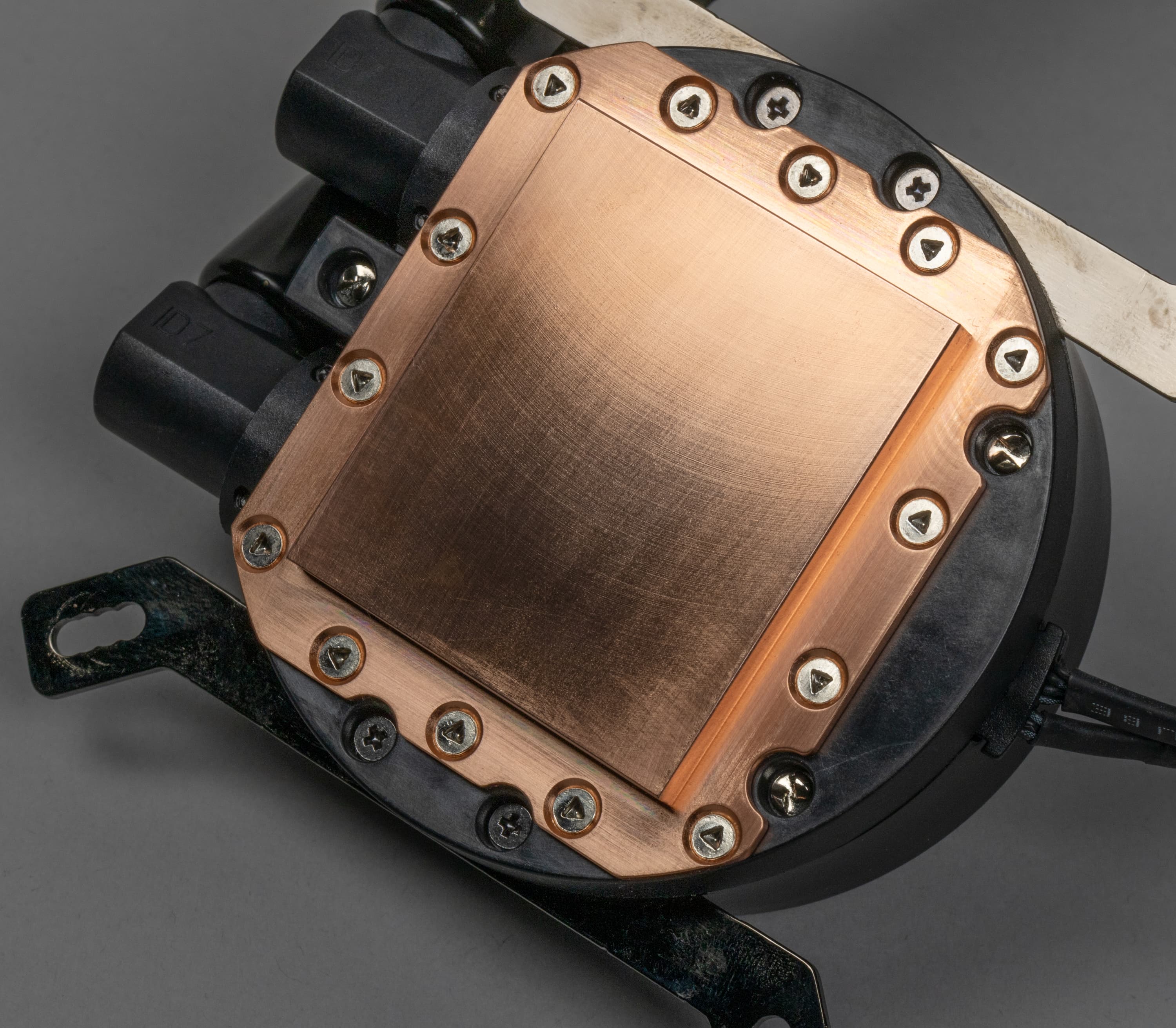 Система герметичная, заправлена, готова к использованию. Помпа интегрирована в один блок с теплосъемником. Производитель указывает, что водоблок двухкамерный, видимо сверху камера помпы, а снизу — камера теплосъемника. Теплосъемник изготовлен из меди. Его центральная прямоугольная часть (48×41 мм), непосредственно прилегающая к крышке процессора, выступает на 4 мм относительно фланца с крепежными отверстиями. Плоскости теплосъемника шлифованные, но не полированные. Рабочая поверхность чуть-чуть, где-то на 0,1 мм, выпуклая к центру.