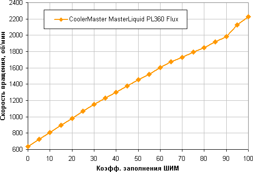 Отличный результат — монотонный рост скорости вращения при изменении коэффициента заполнения от 0% до 100%, диапазон регулировки скорости вращения широкий. При снижении коэффициента заполнения (КЗ) до 0 вентиляторы не останавливаются. Это может иметь значение, если пользователь хочет создать гибридную систему охлаждения, которая при низкой нагрузке работает полностью или частично в пассивном режиме.