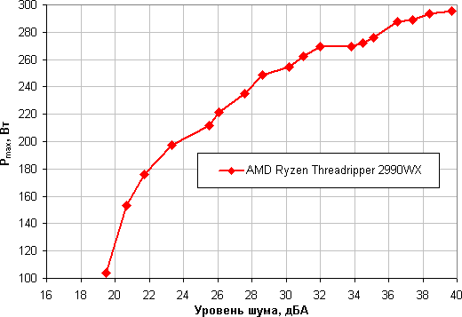 Ограничившись указанными выше условиями, построим зависимость реальной максимальной мощности (обозначенной как Pmax), потребляемой процессором, от уровня шума уже в случае AMD Ryzen Threadripper 2990WX: