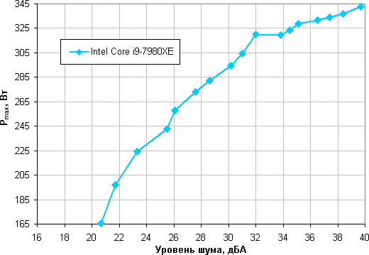 Приняв 25 дБА за критерий условной бесшумности, получим примерную максимальную мощность процессоров, соответствующих этому уровню. Это порядка 240 Вт для процессора Intel Core i9-7980XE. Если не обращать внимания на уровень шума, то пределы мощности можно увеличить где-то до 345 Вт. Еще раз уточним, это в жестких условиях обдува радиатора нагретым до 44 градусов воздухом, при снижении температуры воздуха указанные пределы мощности для бесшумной работы и максимальной мощности возрастают.
